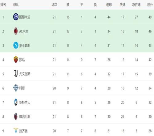 在積分榜上,國際米蘭依然高居榜首,總積分是49分。而AC米蘭贏球之后,總積分達到46分,排名第2,只比國際米蘭少3分。衛冕冠軍那不勒斯43分排名第3,依然有沖擊冠軍的希望。羅馬3連勝之后,殺入了歐冠區,總積分42分排名第4。尤文圖斯則掉到了第5名的位置,總積分是39分。科莫少賽一場,總積分是34分,排名第6。亞特蘭大32分排名第7。博洛尼亞30分排名第8。拉齊奧只拿到28分,排名第9。