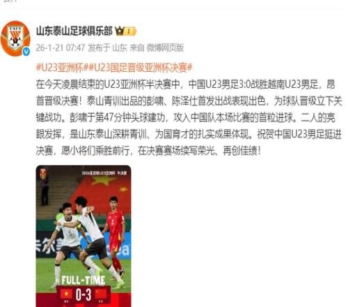 山東泰山官方對兩位小將的表現(xiàn)予以肯定:“泰山青訓(xùn)出品的彭嘯、陳澤仕首發(fā)出戰(zhàn)表現(xiàn)出色,為球隊(duì)晉級立下關(guān)鍵戰(zhàn)功。彭嘯于第47分鐘頭球建功,攻入中國隊(duì)本場比賽的首粒進(jìn)球。二人的亮眼發(fā)揮,是山東泰山深耕青訓(xùn)、為國育才的扎實(shí)成果體現(xiàn)。祝賀中國U23男足挺進(jìn)決賽,愿小將們乘勝前行,在決賽賽場續(xù)寫榮光、再創(chuàng)佳績!”
