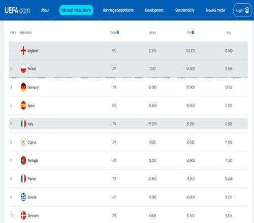 歐戰系數平均積分:英超13.93分暫列第一,德甲第三西甲第四