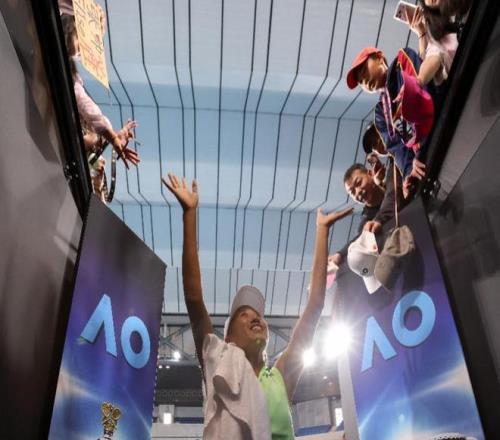 張帥在賽后與觀眾互動。 當地時間1月29日,在墨爾本進行的2026年澳大利亞網球公開賽女雙半決賽中,張帥(中國)/梅爾滕斯(比利時)2比0戰勝柴原瑛菜(日本)/茲沃納列娃(俄羅斯),晉級決賽。 新華社記者 馬平 攝